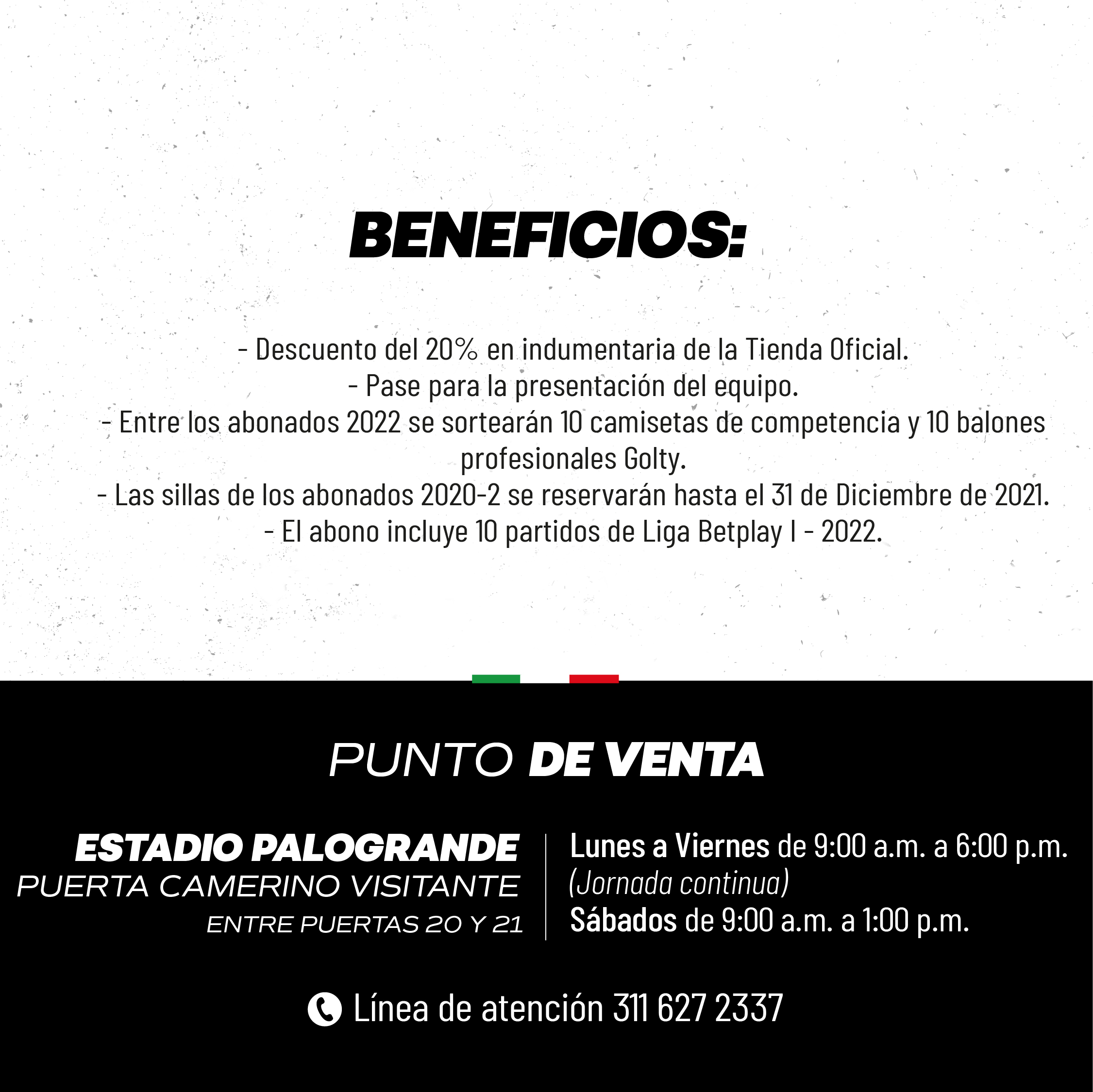 La venta de los abonos para la temporada 2022-1 se lleva a cabo en el camerino visitante del estadio Palogrande, con muy buena acogida por parte de los aficionados, muchos de los cuales destacan los bajos precios y los beneficios que se obtienen con la adquisición del abono.