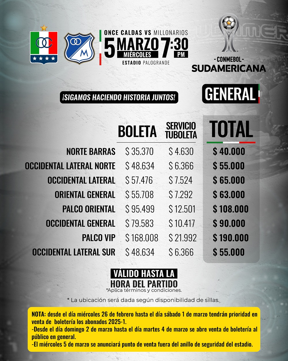 Boletería vs Millonarios ¡VAMOS POR LA COPA SUDAMERICANA!
